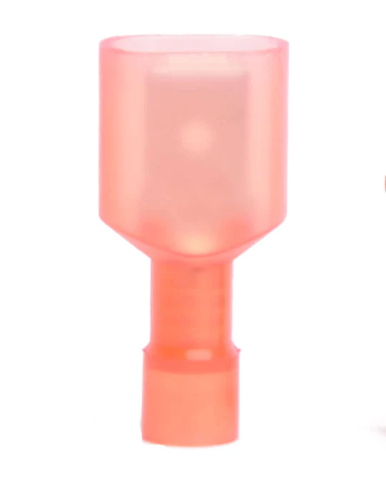 Red nylon insulated male disconnect terminal for 22-18 AWG wire size provides secure quick connect and disconnect functionality with safety insulation. Designed to mate with a 0250 inch female tab, this connector offers excellent conductivity, corrosion resistance and reliable performance for automotive, industrial and electrical wiring needs.