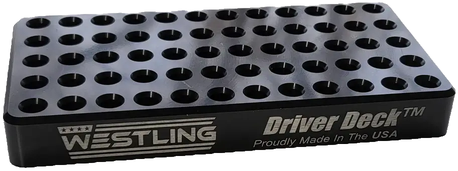 The Westling driver deck provides a reliable solution to store, sort, and access your 1/4″” bits quickly, reducing clutter and saving time during projects. Its precision-machined slots hold bits firmly in place while preventing tipping or movement, ensuring each bit is ready for use when needed.